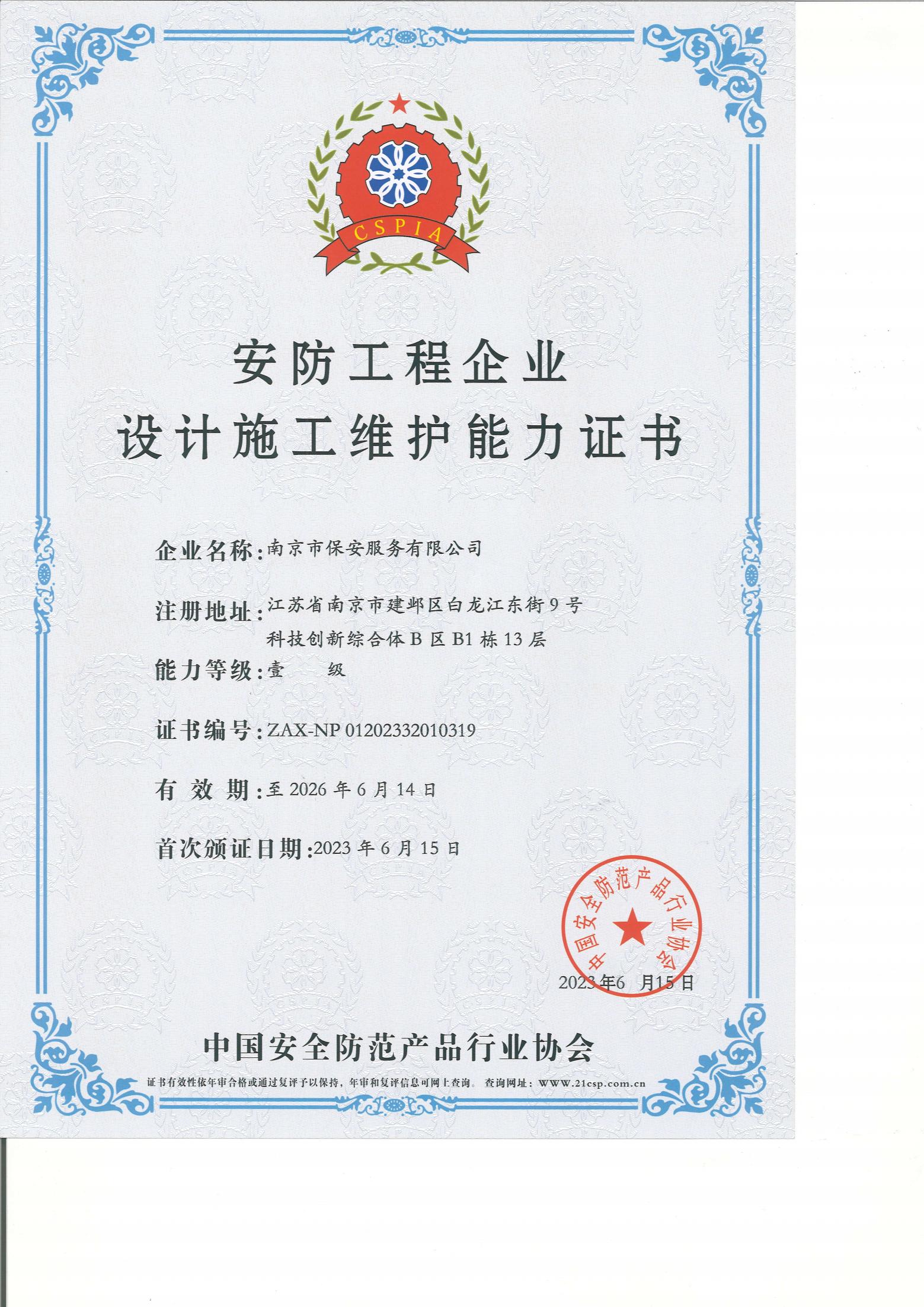 安防工程企業(yè)設(shè)計(jì)施工維護(hù)能力證書(一級(jí))