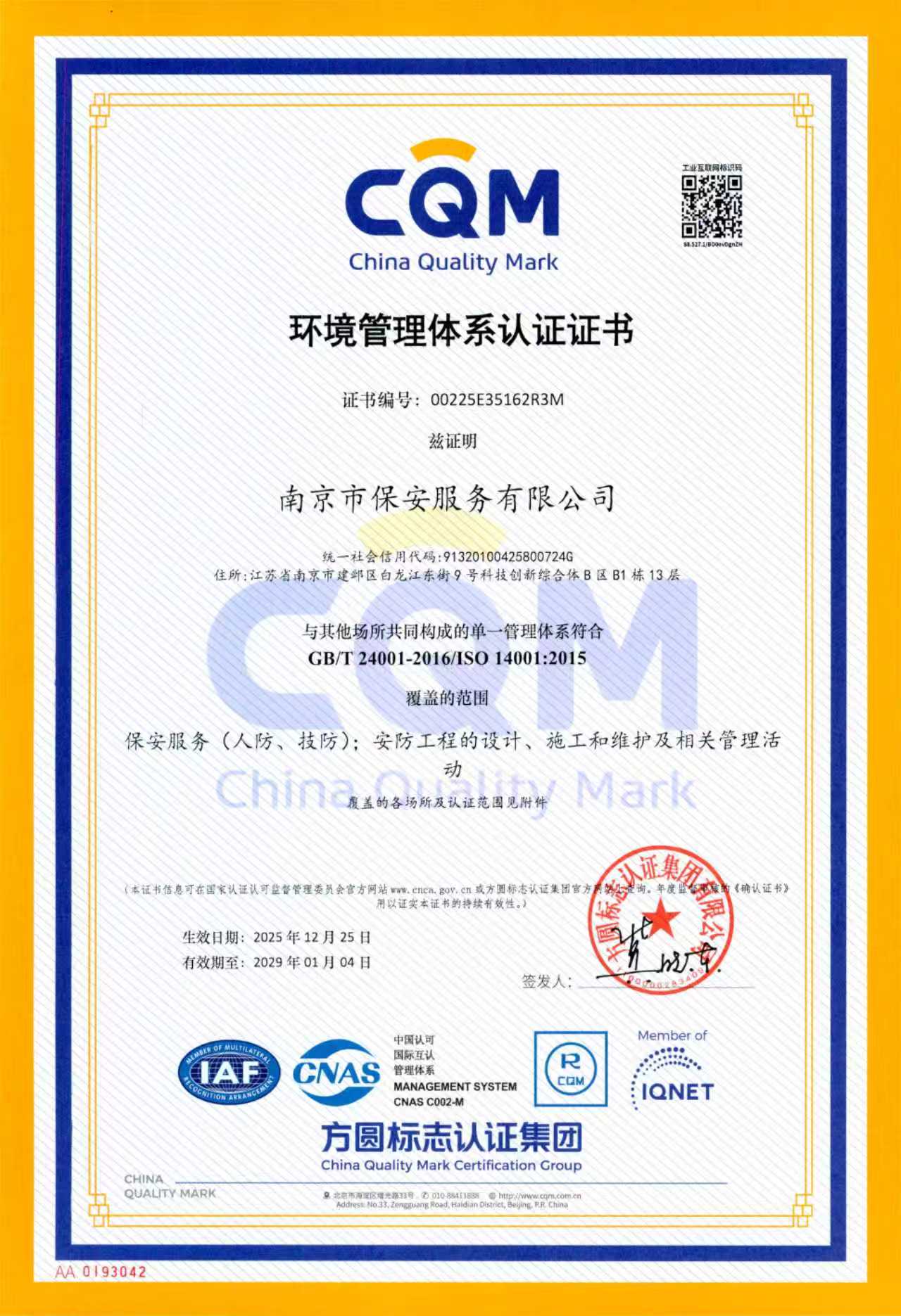 環(huán)境管理體系認(rèn)證證書