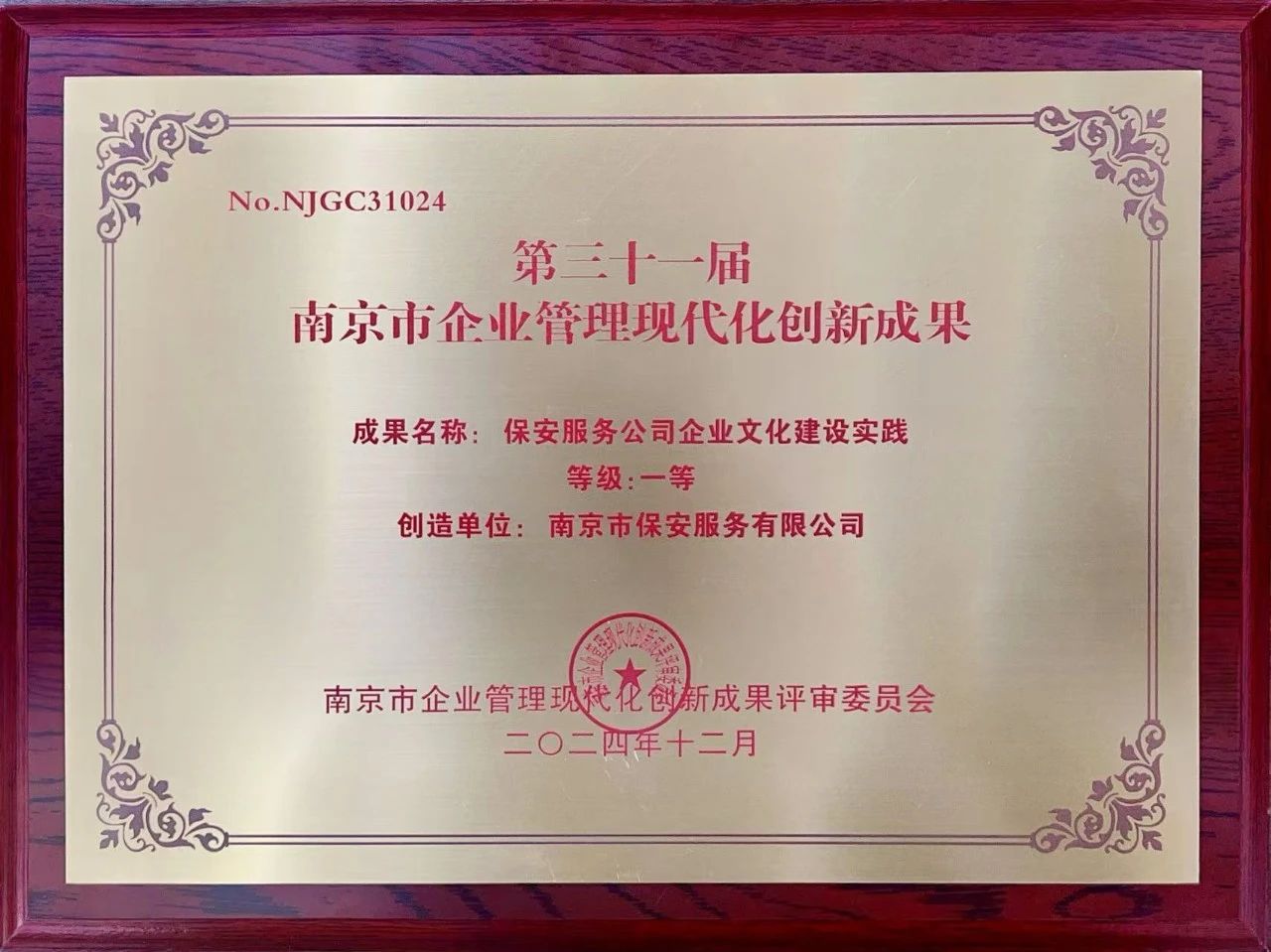 喜報!南京市保安服務(wù)有限公司榮獲第31屆南京市企業(yè)管理現(xiàn)代化創(chuàng)新成果一等獎