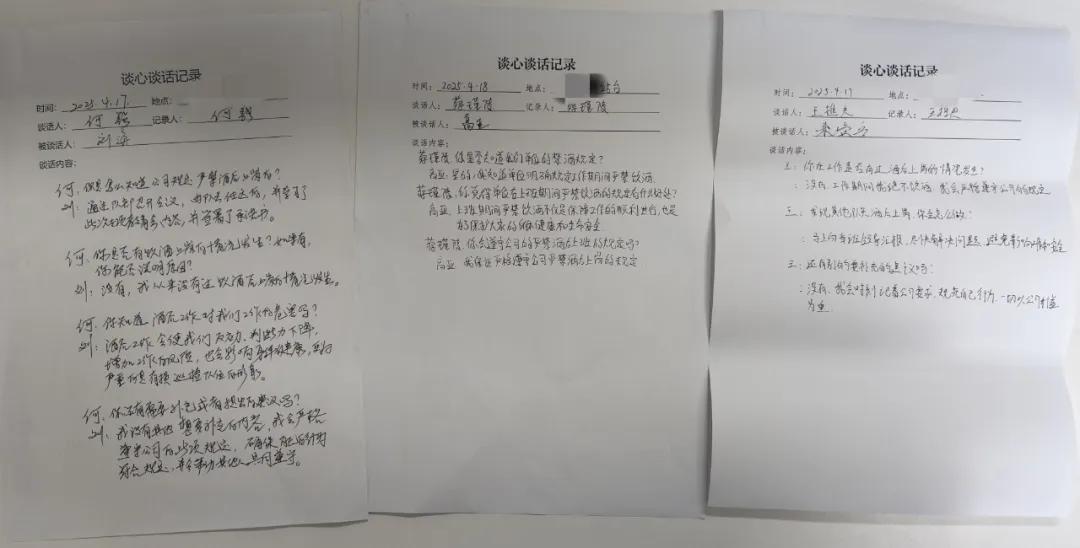 公司各部門組織開展全覆蓋式涉酒等風(fēng)險(xiǎn)隱患排查,通過“一對一”談話、“面對面”提醒等方式,深入排查重點(diǎn)人員、關(guān)鍵環(huán)節(jié),確保風(fēng)險(xiǎn)隱患無遺漏、無死角。