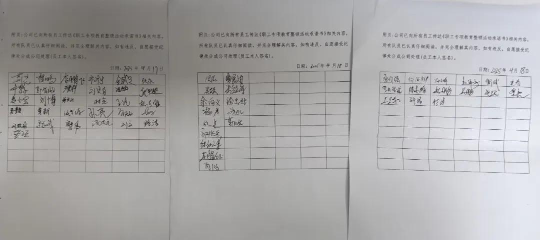 公司組織全體人員簽署《職工專項(xiàng)教育整頓活動承諾書》,健全動態(tài)監(jiān)管制度,把報(bào)備、提醒、監(jiān)督等工作做扎實(shí)。同時(shí),建立“單位+家庭”雙監(jiān)督機(jī)制,充分發(fā)揮“八小時(shí)外”的家庭監(jiān)督作用,做到家屬常問常提醒,形成全天候監(jiān)督管理閉環(huán)。